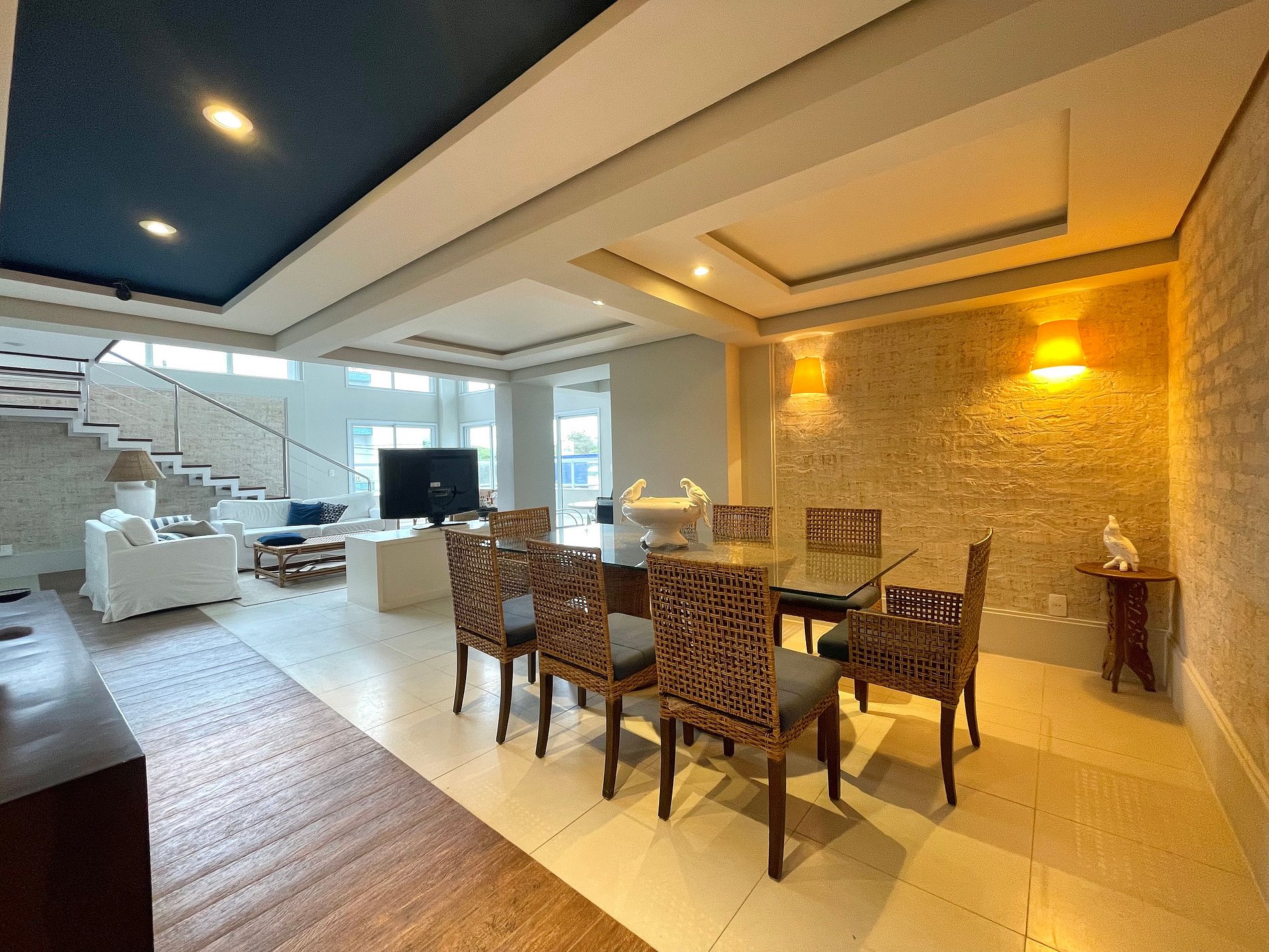 Primeiro pavimento: sala de jantar, cozinha completa, sala de estar com pé direito duplo e grandes aberturas, varanda com vista pro mar. 1 suíte com 2 camas de solteiro, lavabo e área de serviço.