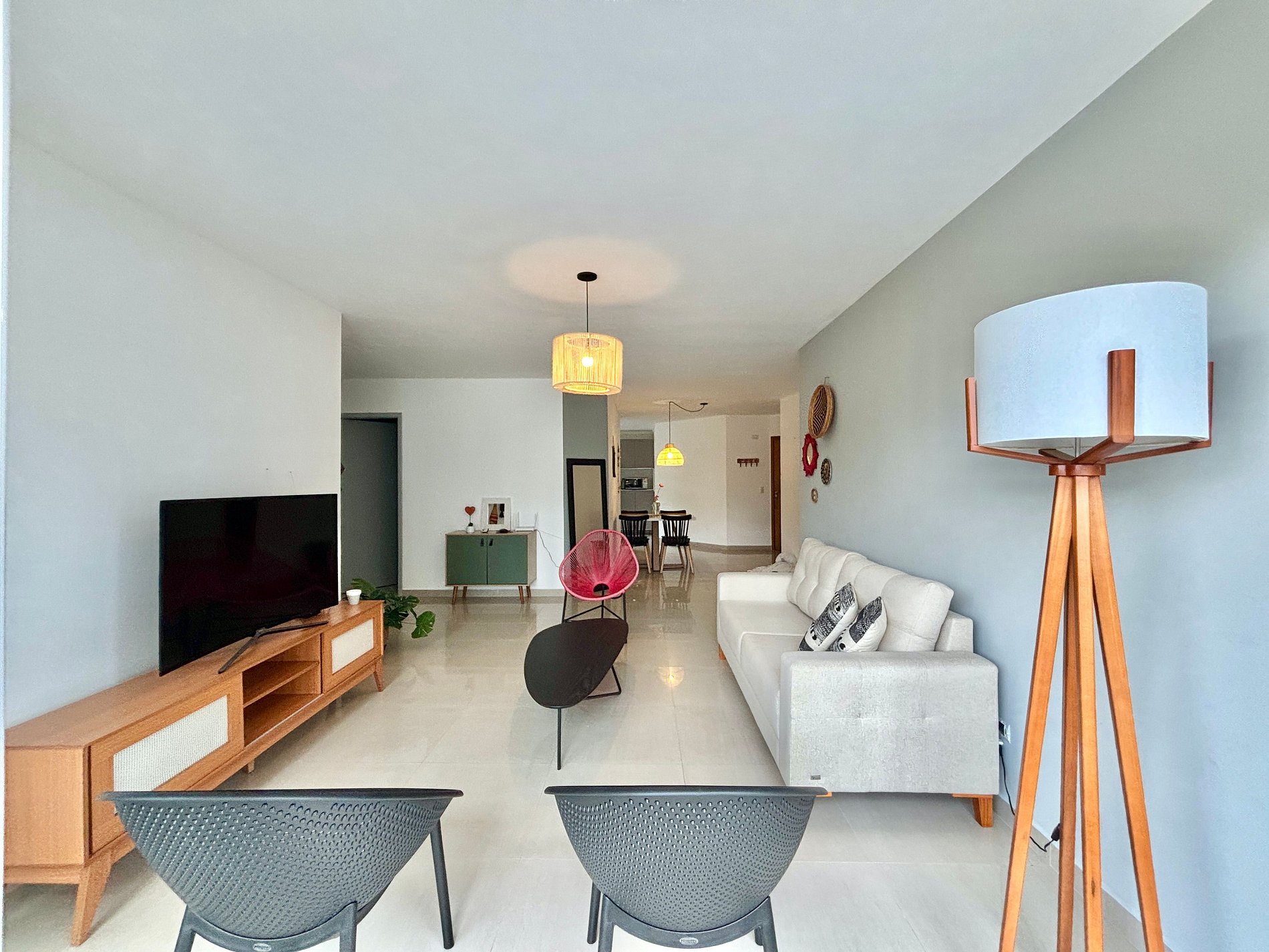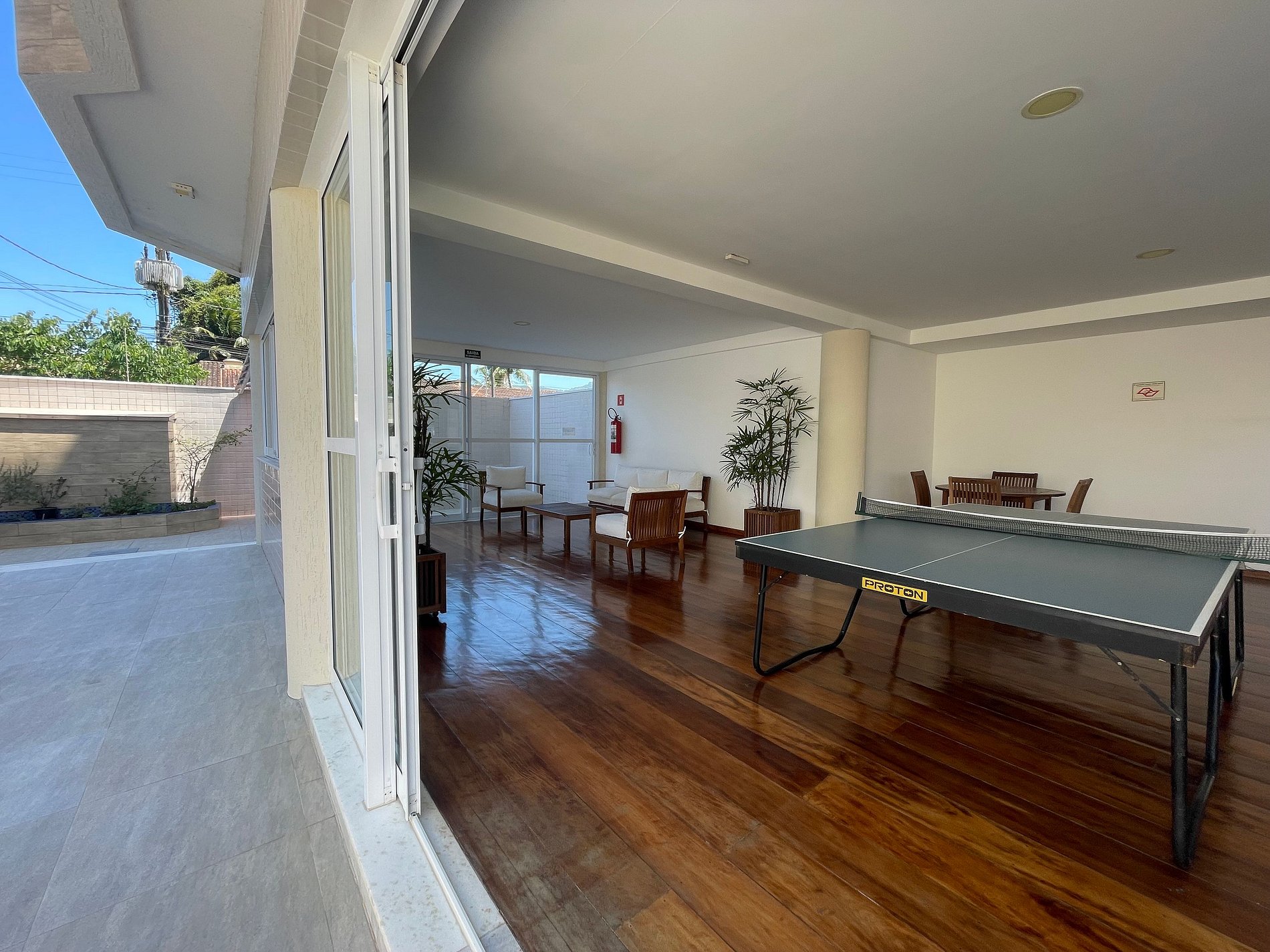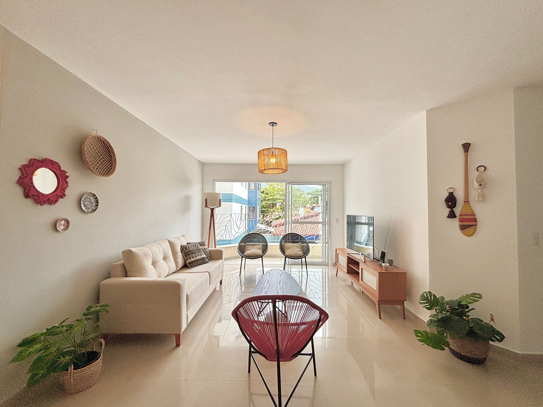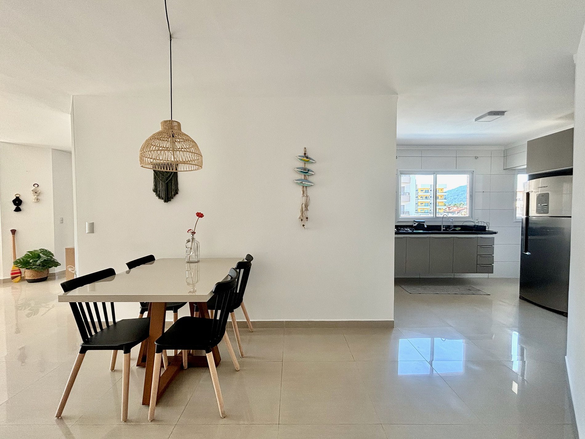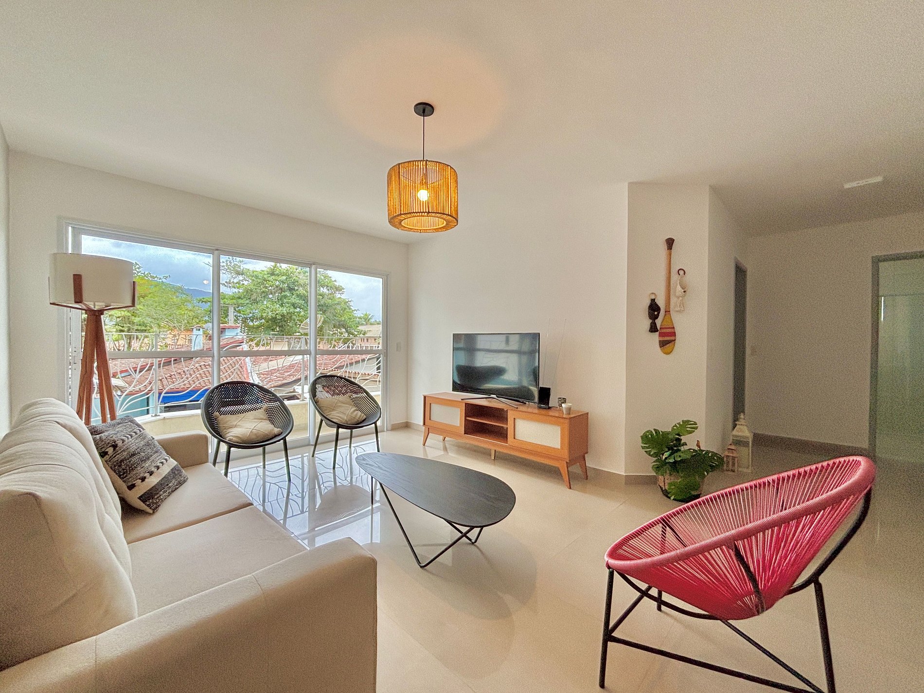 Sala ampla com varanda e cozinha integrada e lavabo.