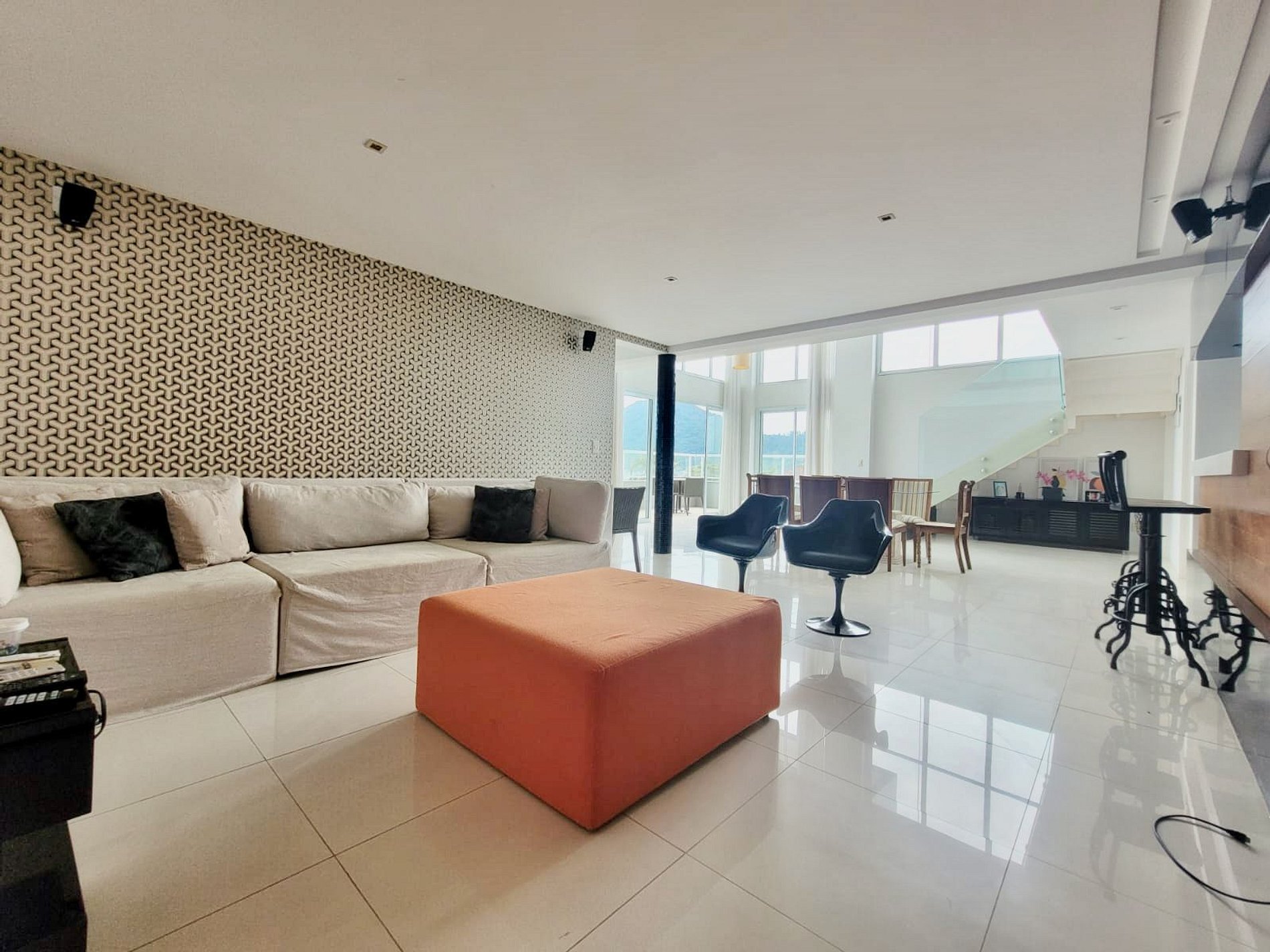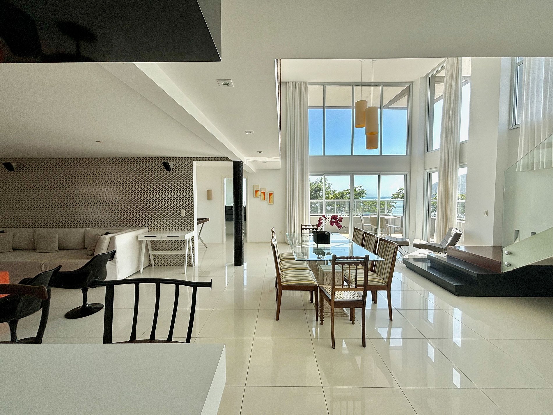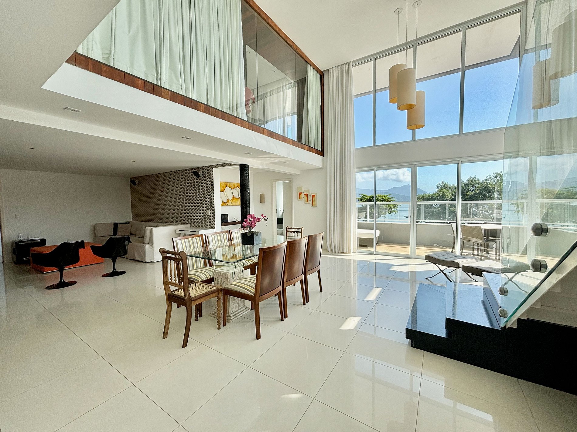 Primeiro pavimento: sala de jantar, cozinha completa, sala de estar com pé direito duplo e grandes aberturas, varanda com vista pro mar. 1 suíte com 1 cama king, lavabo e área de serviço.