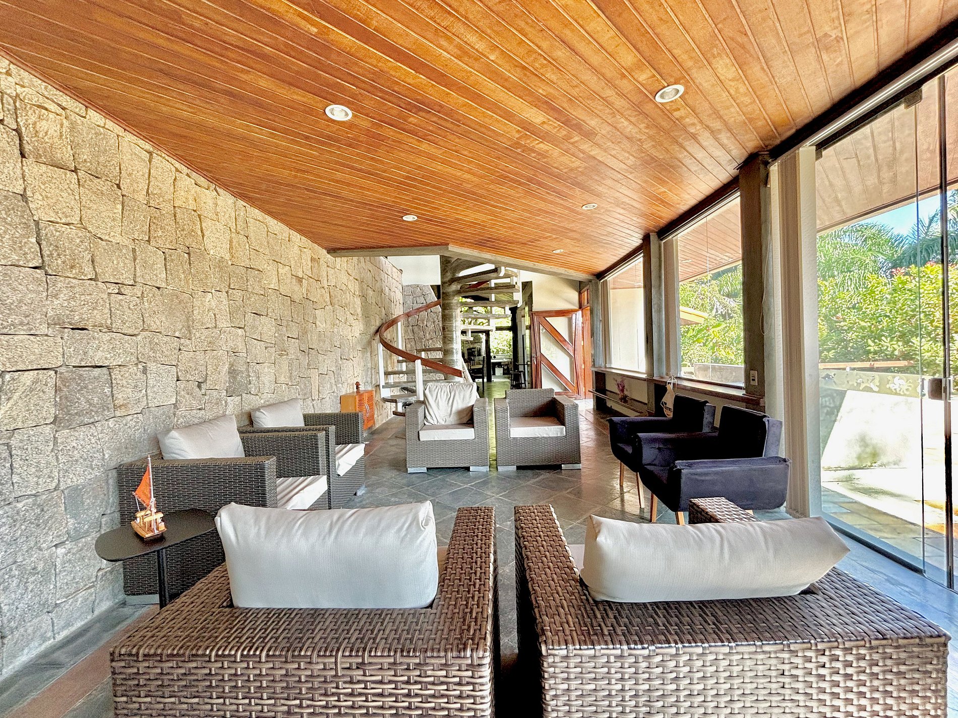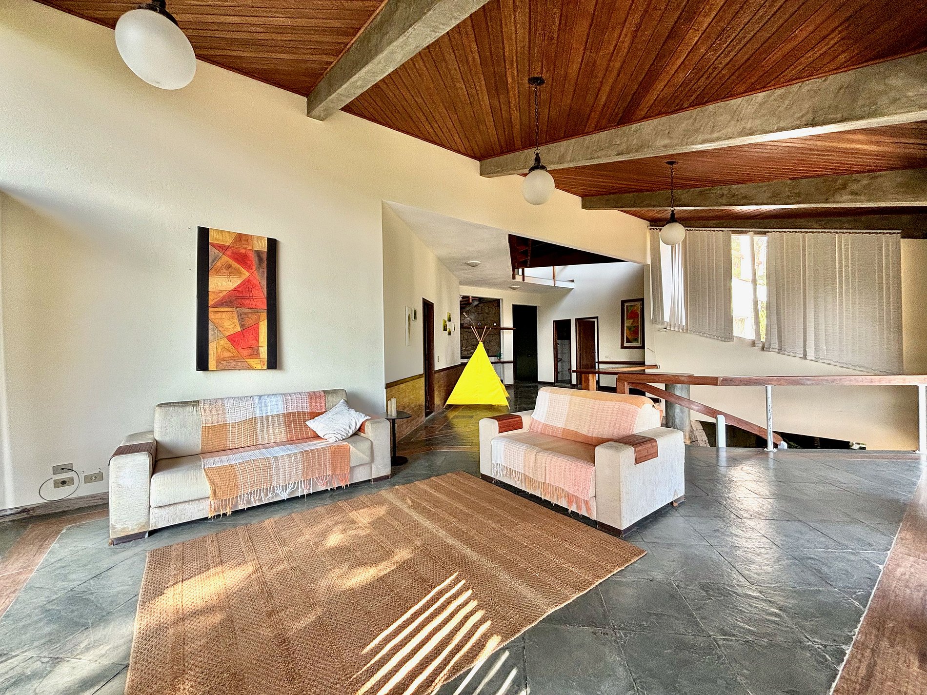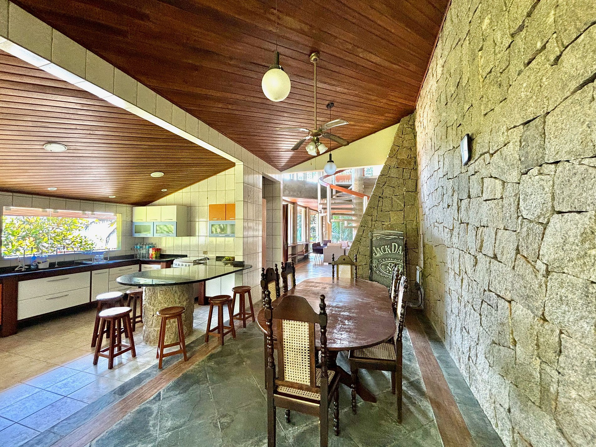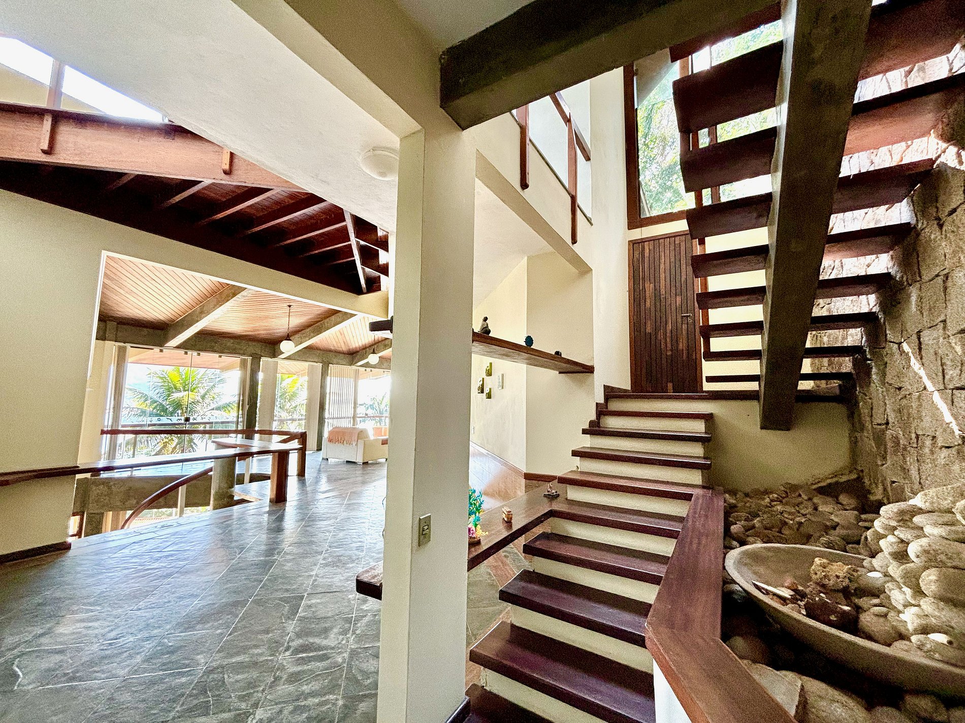 A arquitetura da casa oferece vários espaços de convivência, cada um em um nível diferente, sempre oferecendo visual deslumbrante.