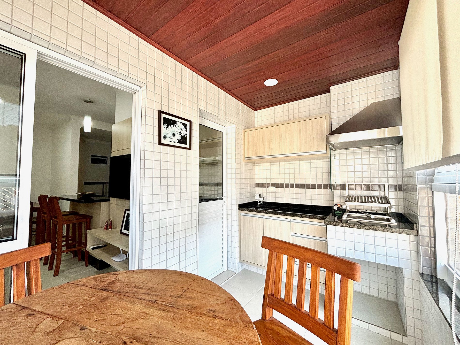 Espaço de convivência integrado, com uma varanda gourmet com pia e churrasqueira e vista lateral para o mar.