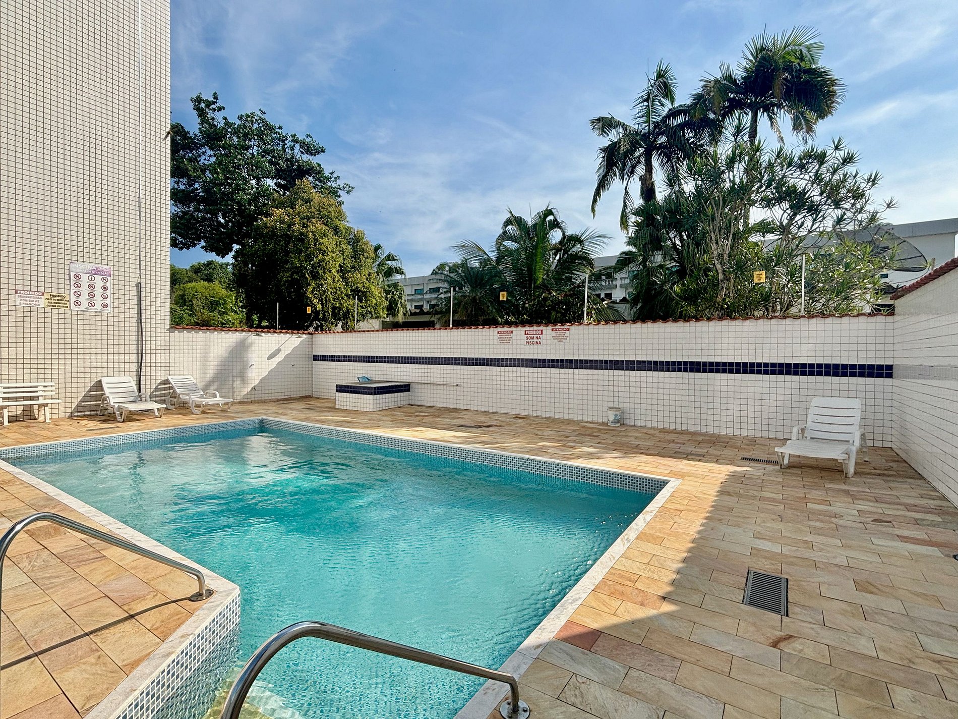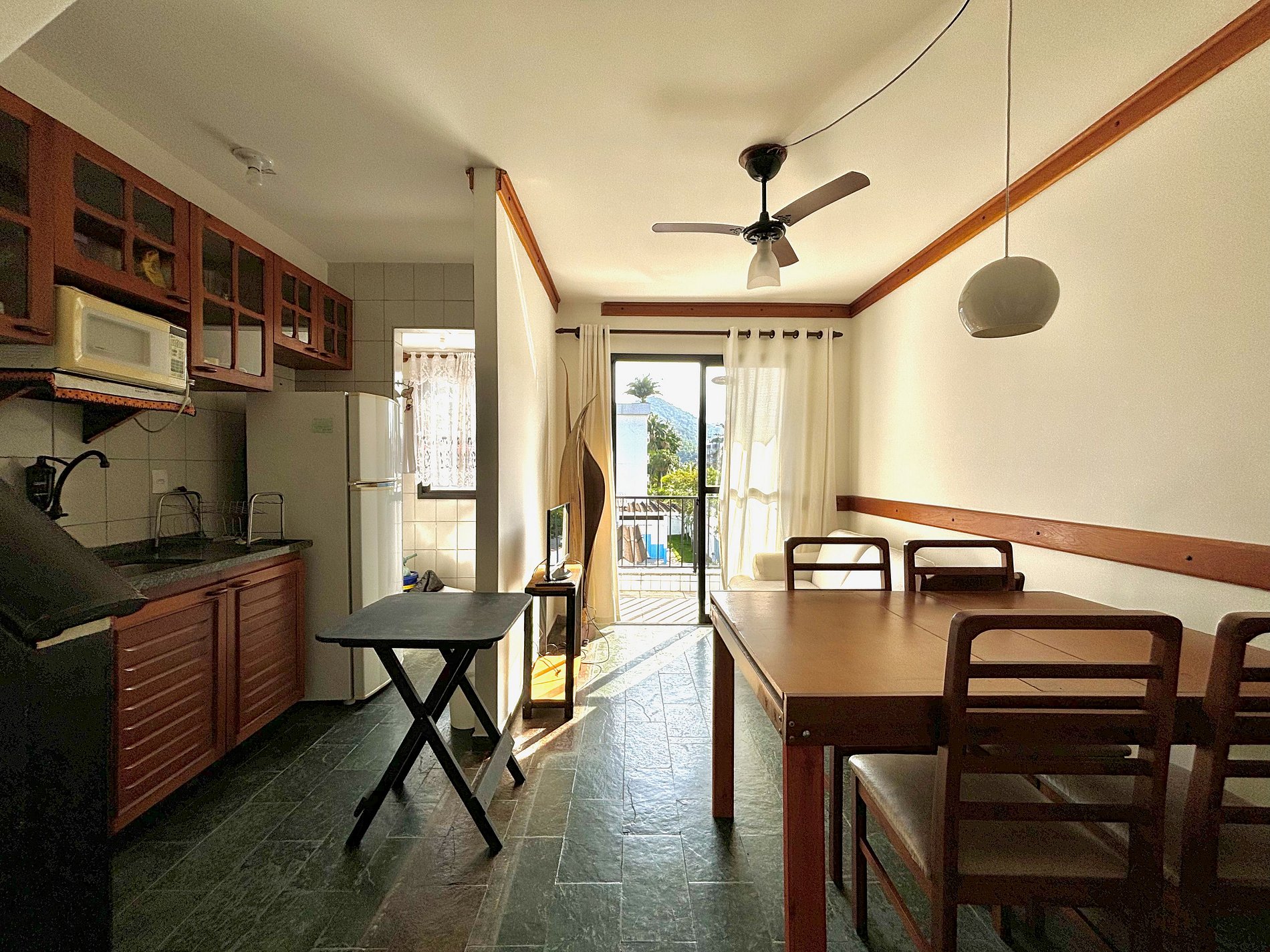 Apartamento totalmente mobiliado e equipado, com espaço de convivência integrado e varanda gourmet com churrasqueira na parte superior.