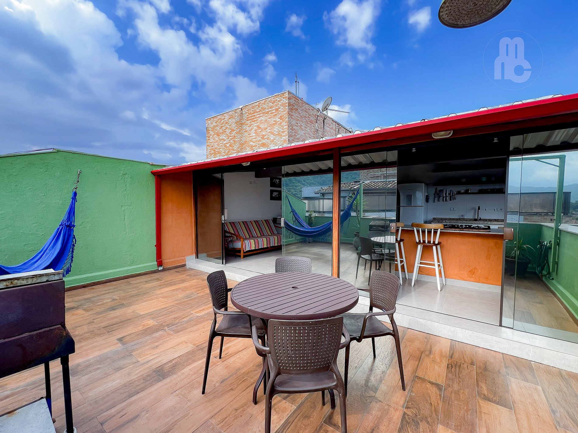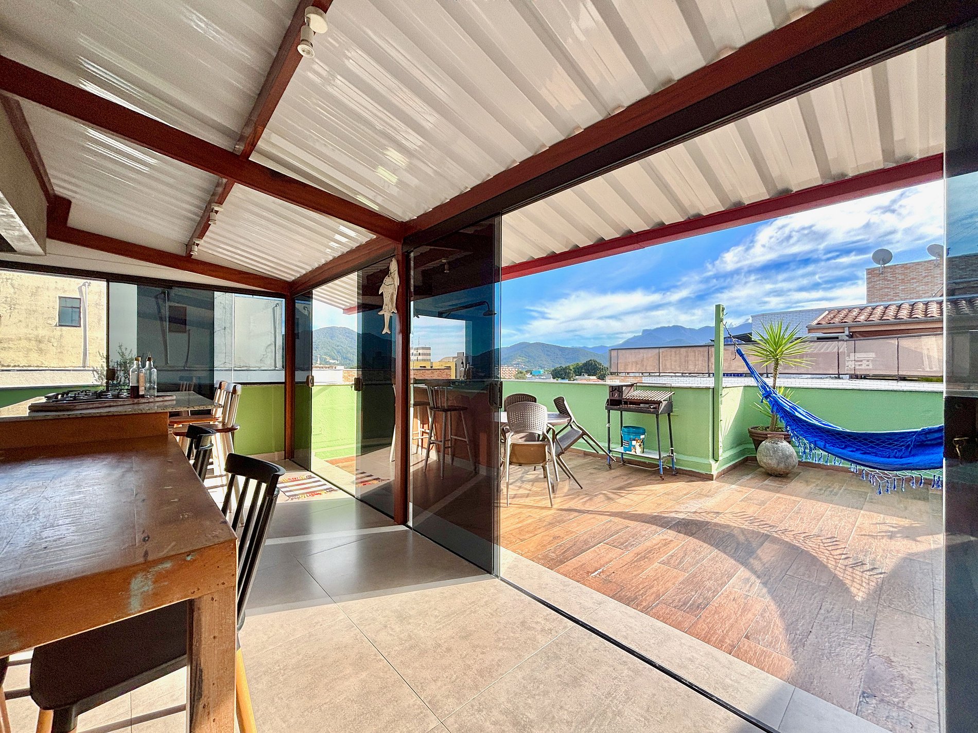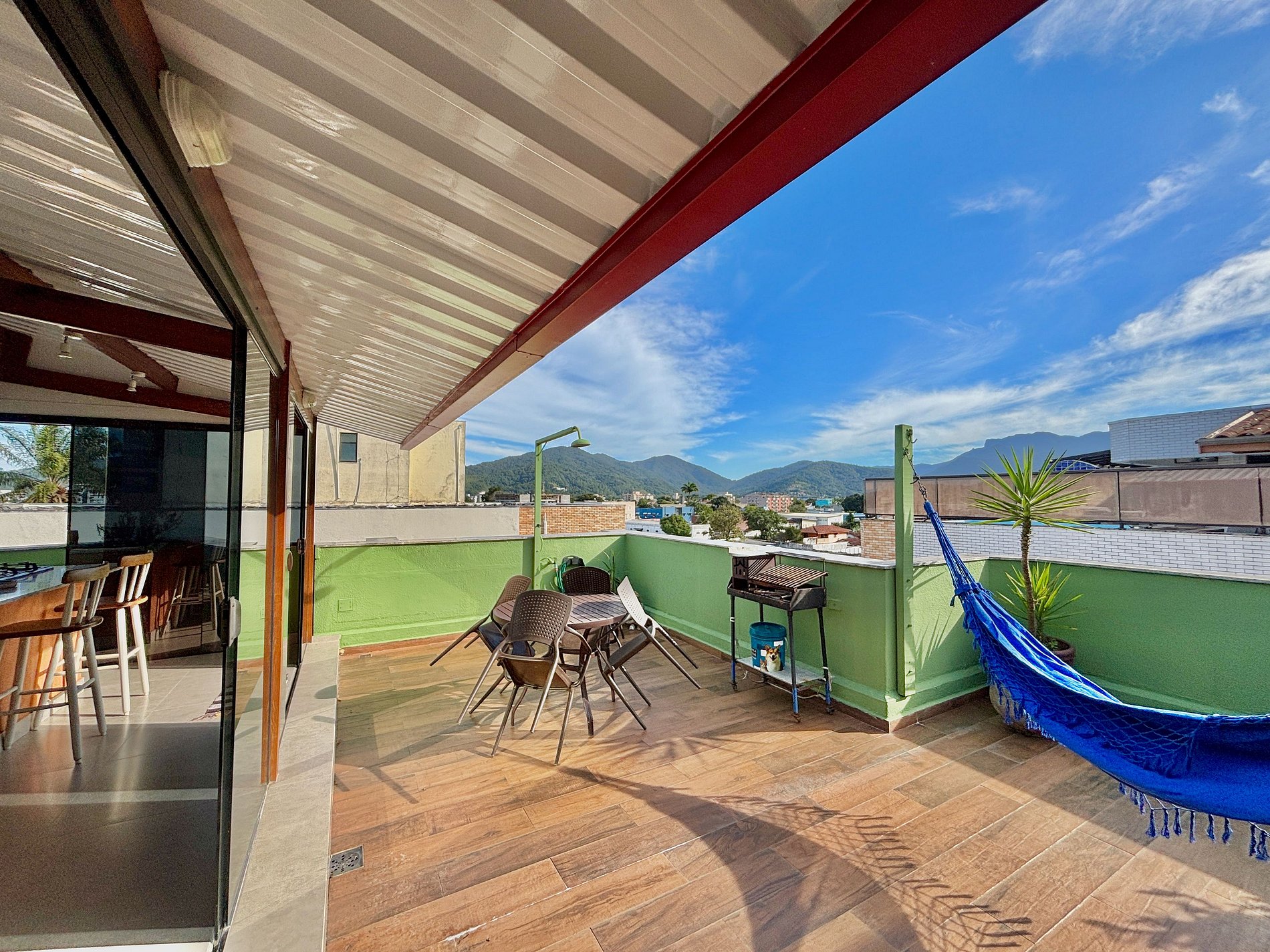 - amplo espaço de convivência interno e externo com cozinha integrada a área de churrasco com churrasqueira, chuveirão e redes de descanso.