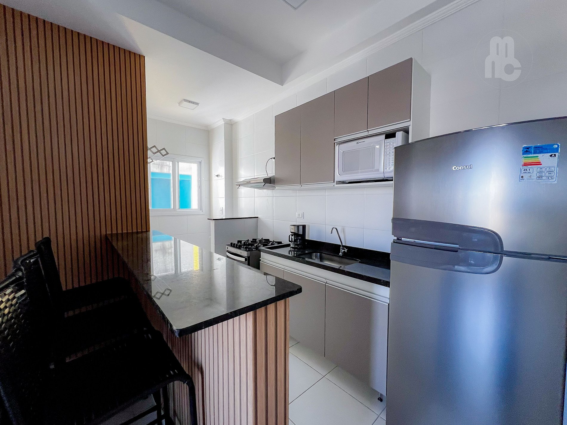 Cozinha, sala de estar e sala de jantar integradas + ar condicionado.