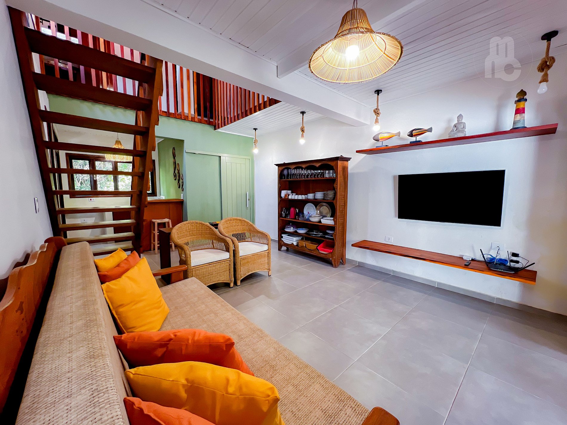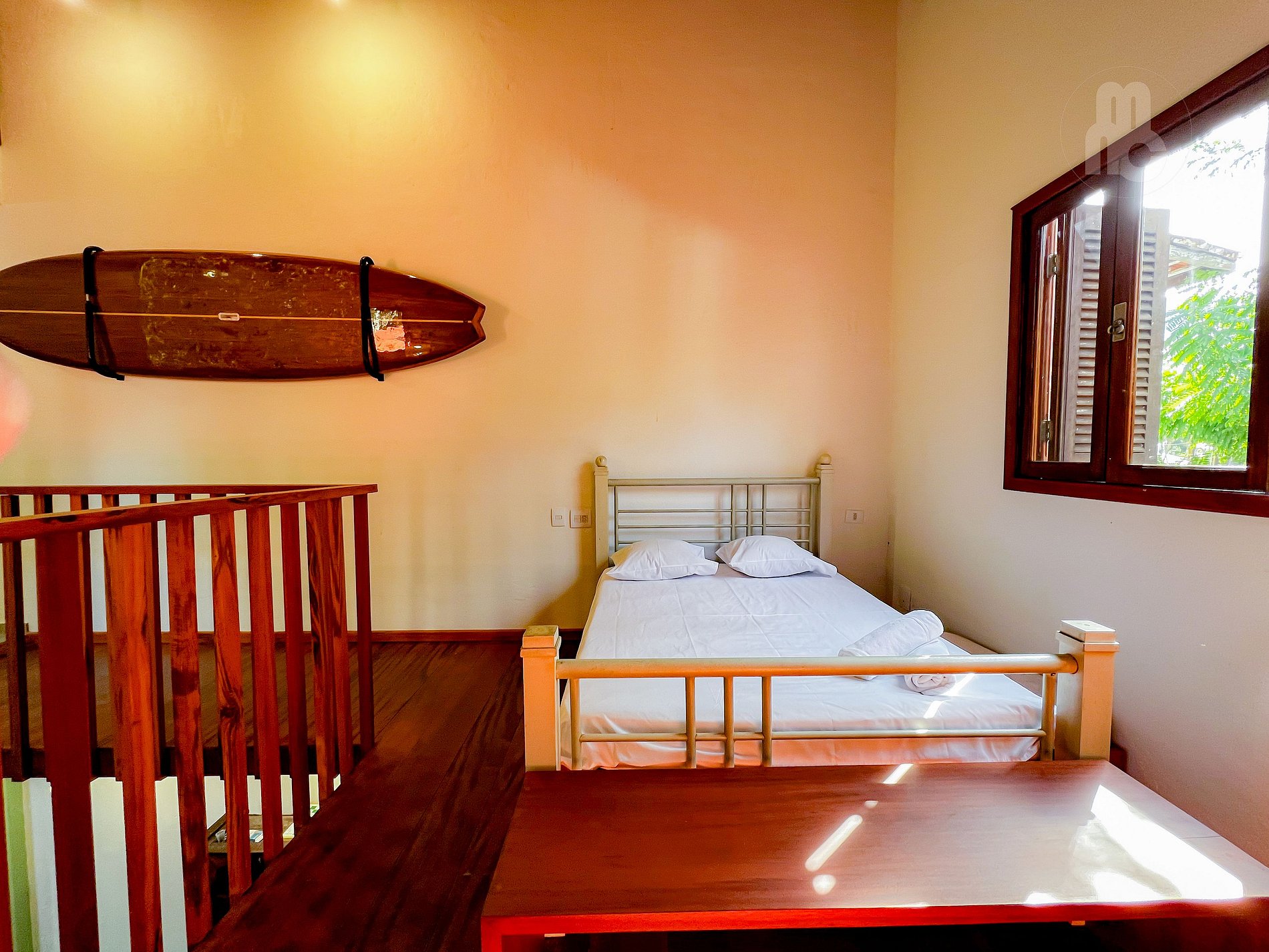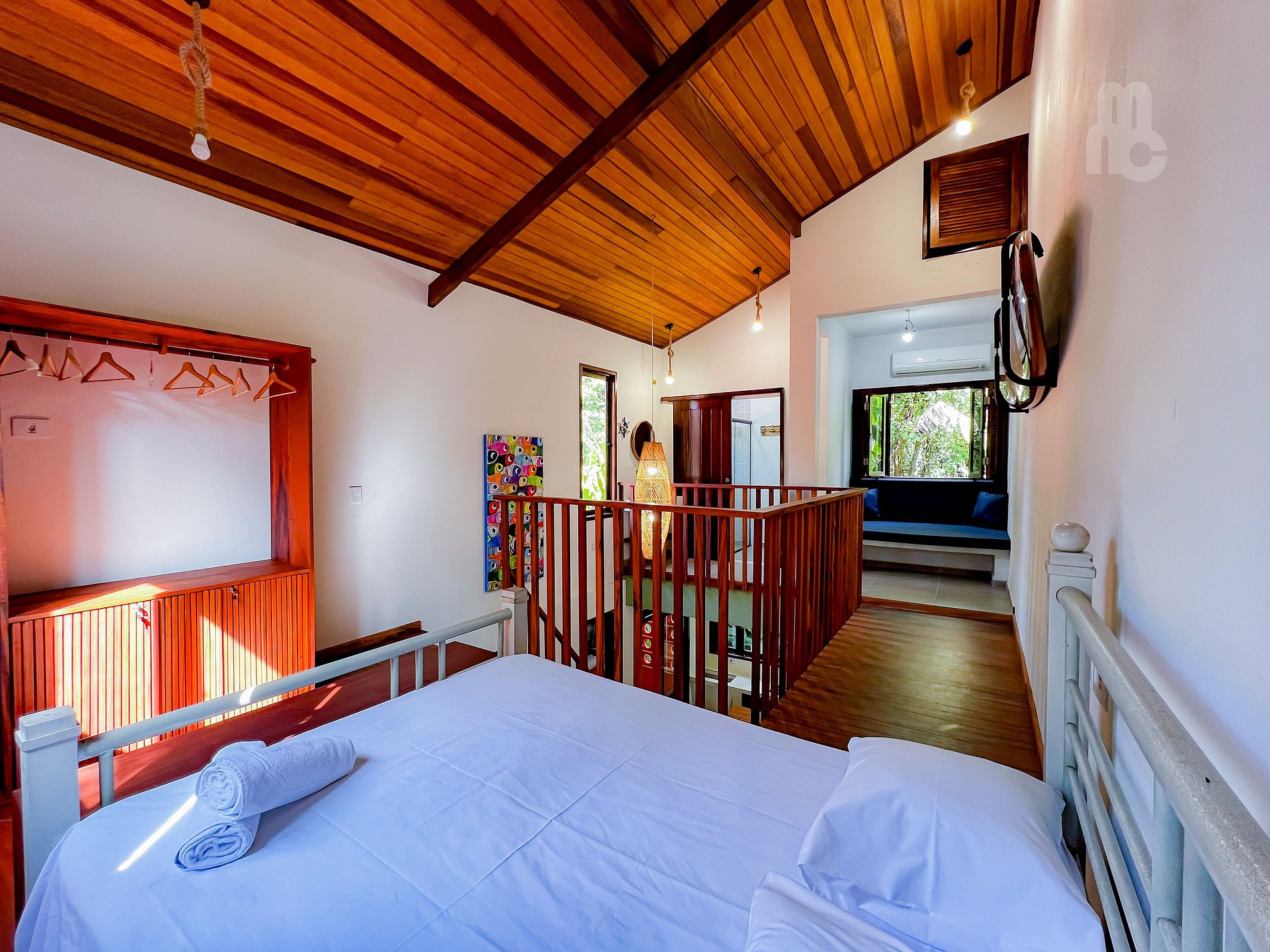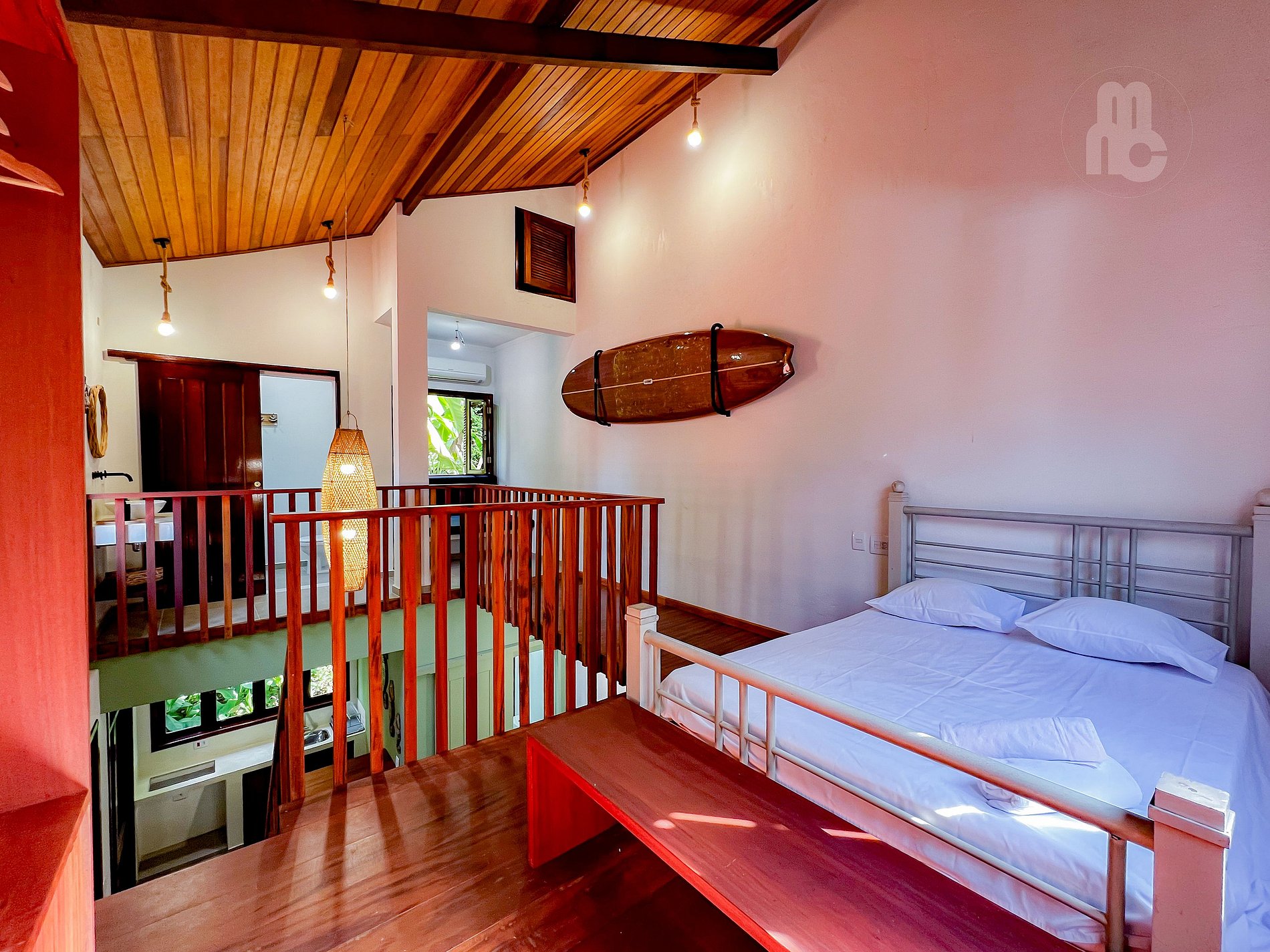- Mezanino com 1 suíte ampla com 1 cama de casal e 1 bicama de solteiro + área de leitura + ar condicionado e armário;
