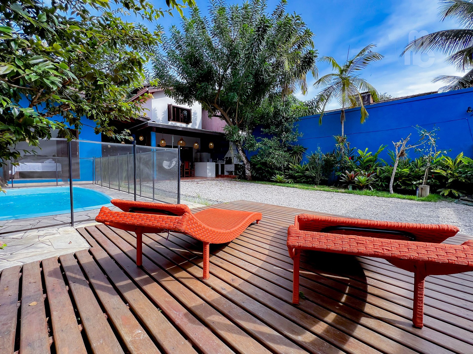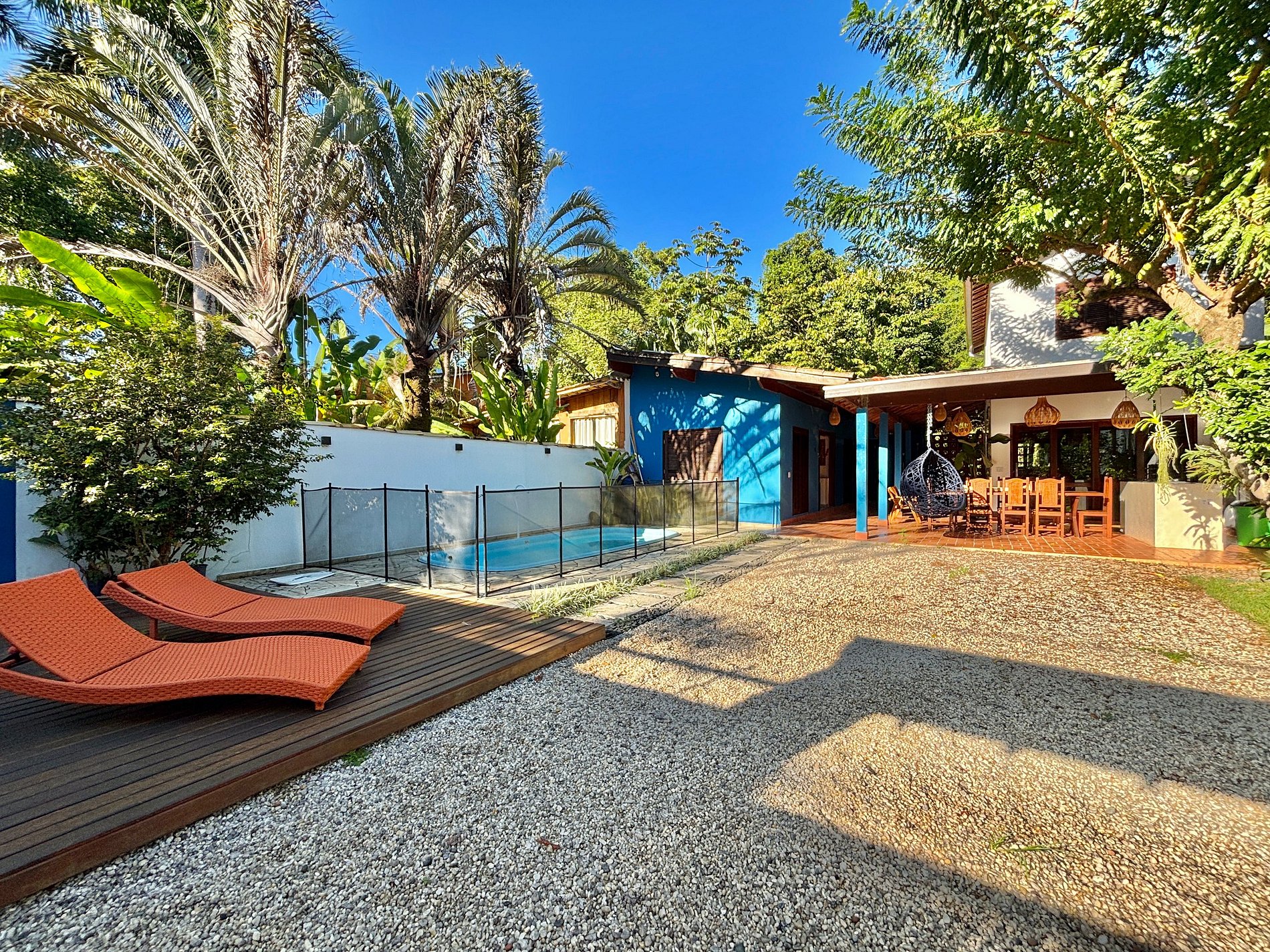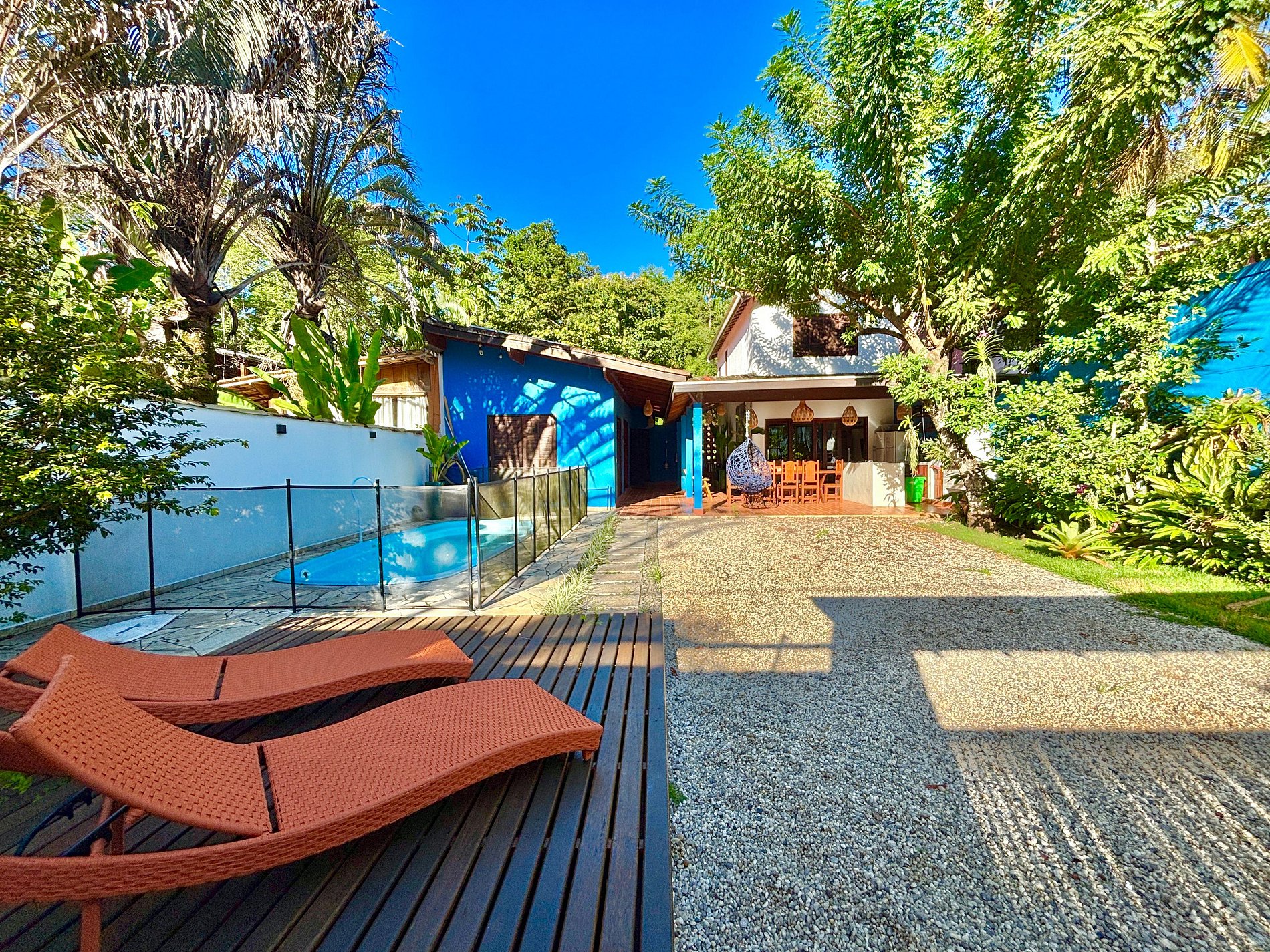 - Área externa com piscina e cerca, deck com espriguiçadeiras, chuveirão e jardim;