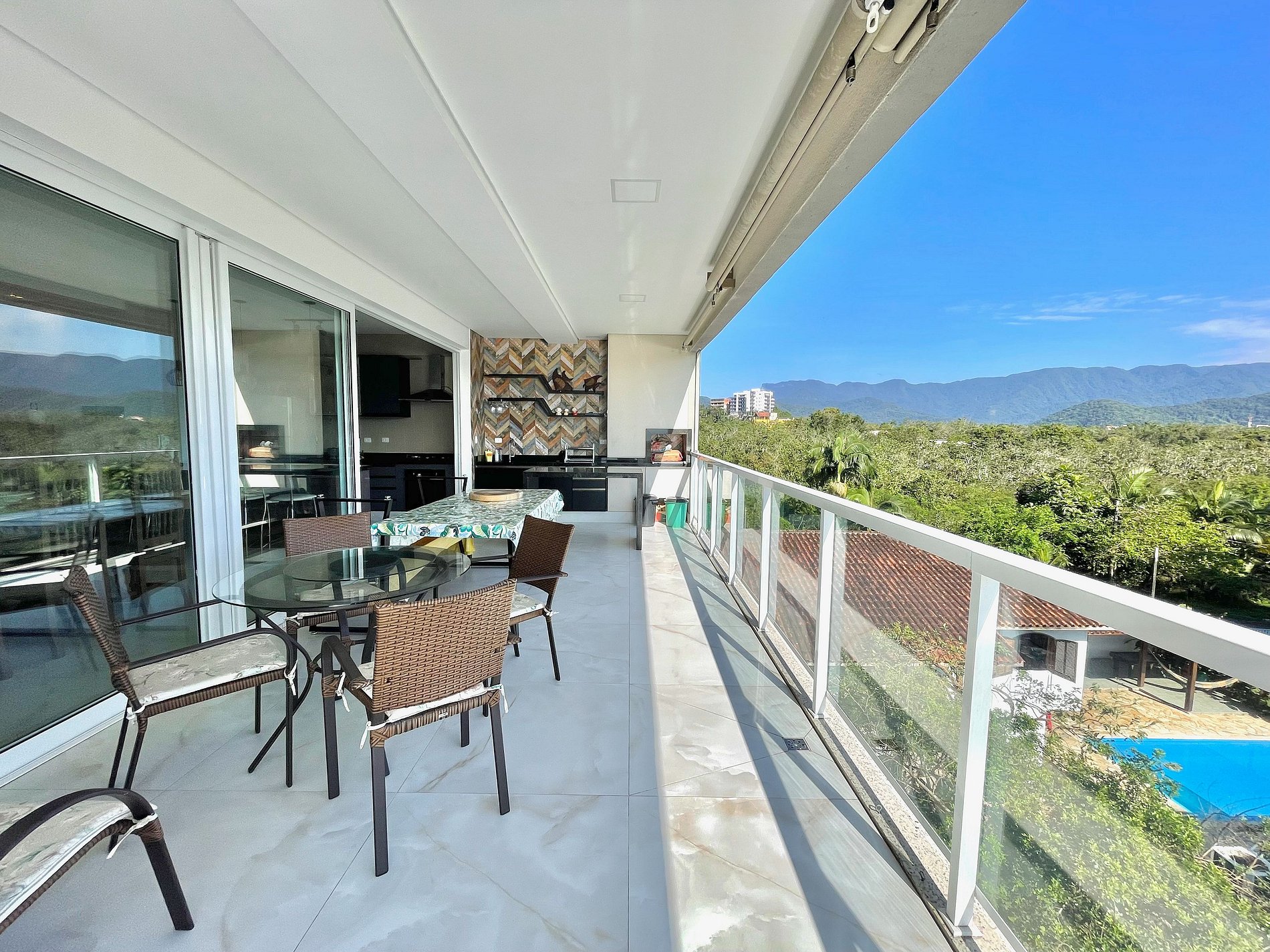 Cozinha super completa e moderna. Ampla varanda com churrasqueira com vista para as montanhas e para o mar.