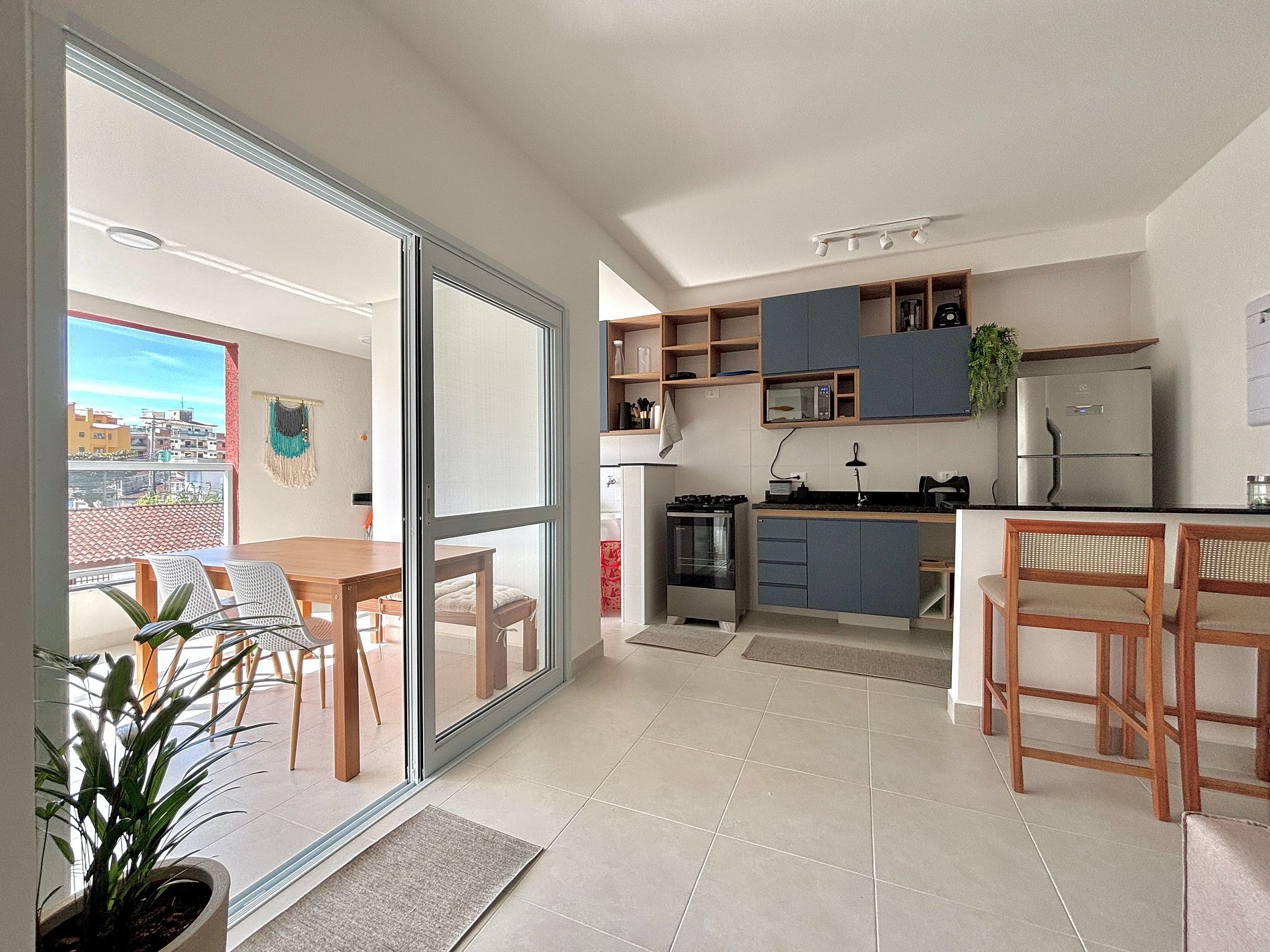 Apartamento muito aconchegante e confortável, decorado e mobiliado com muito bom gosto. Espaço de convivência integrado, com uma varanda gourmet com pia e churrasqueira. Cozinha integrada completa.