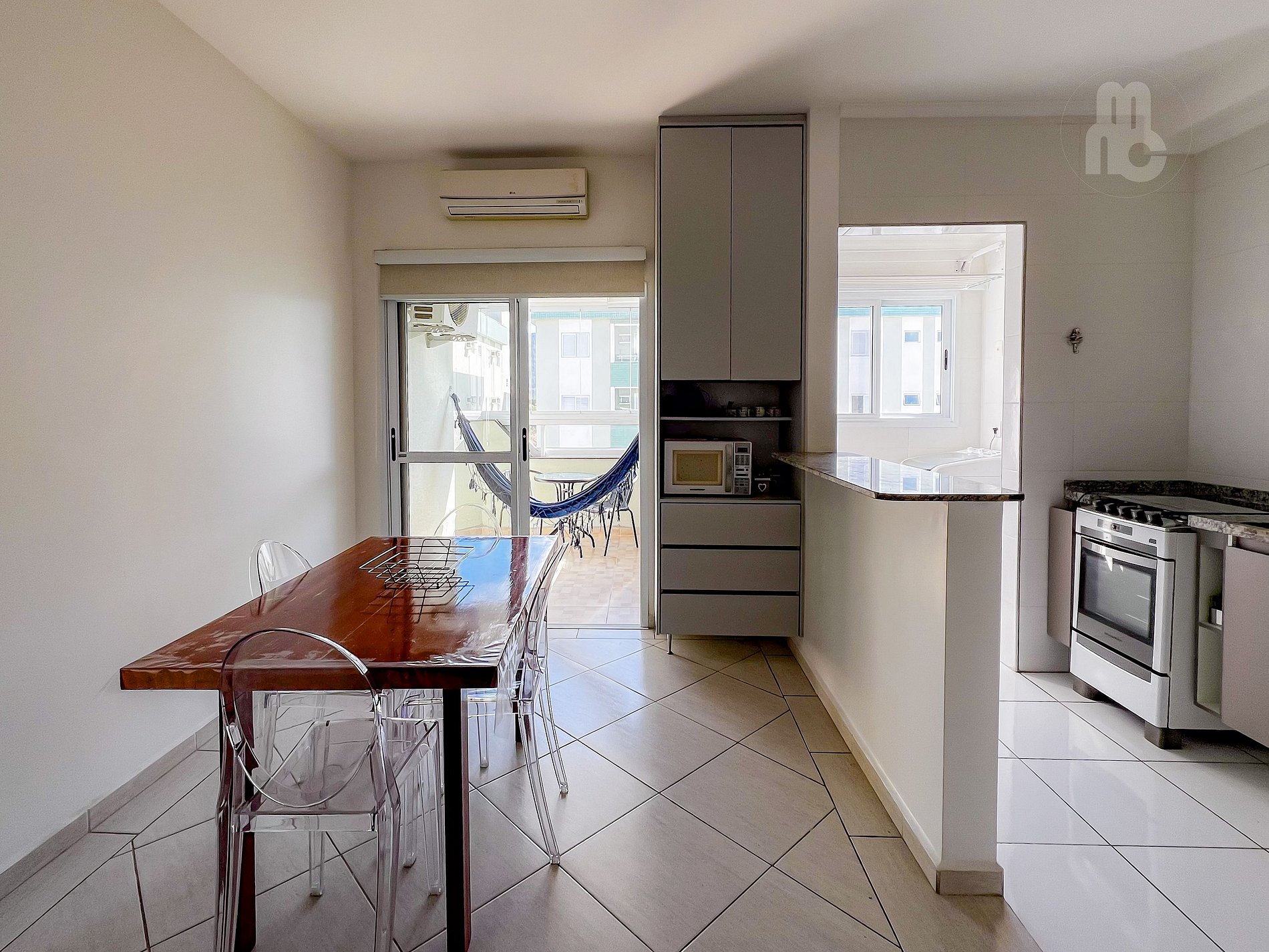 Cozinha, sala de estar e sala de jantar integradas + ar condicionado