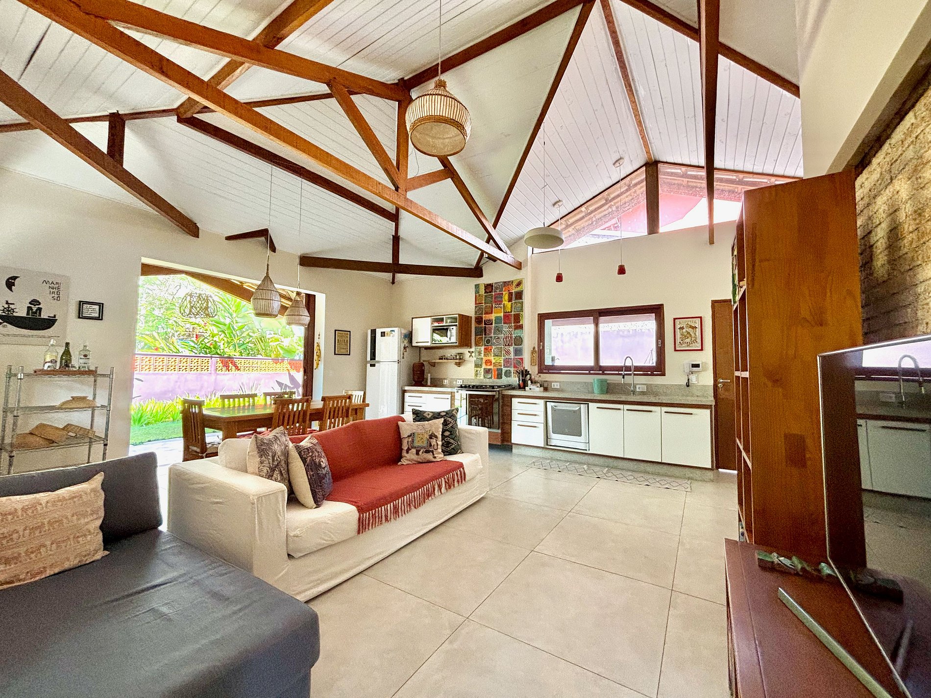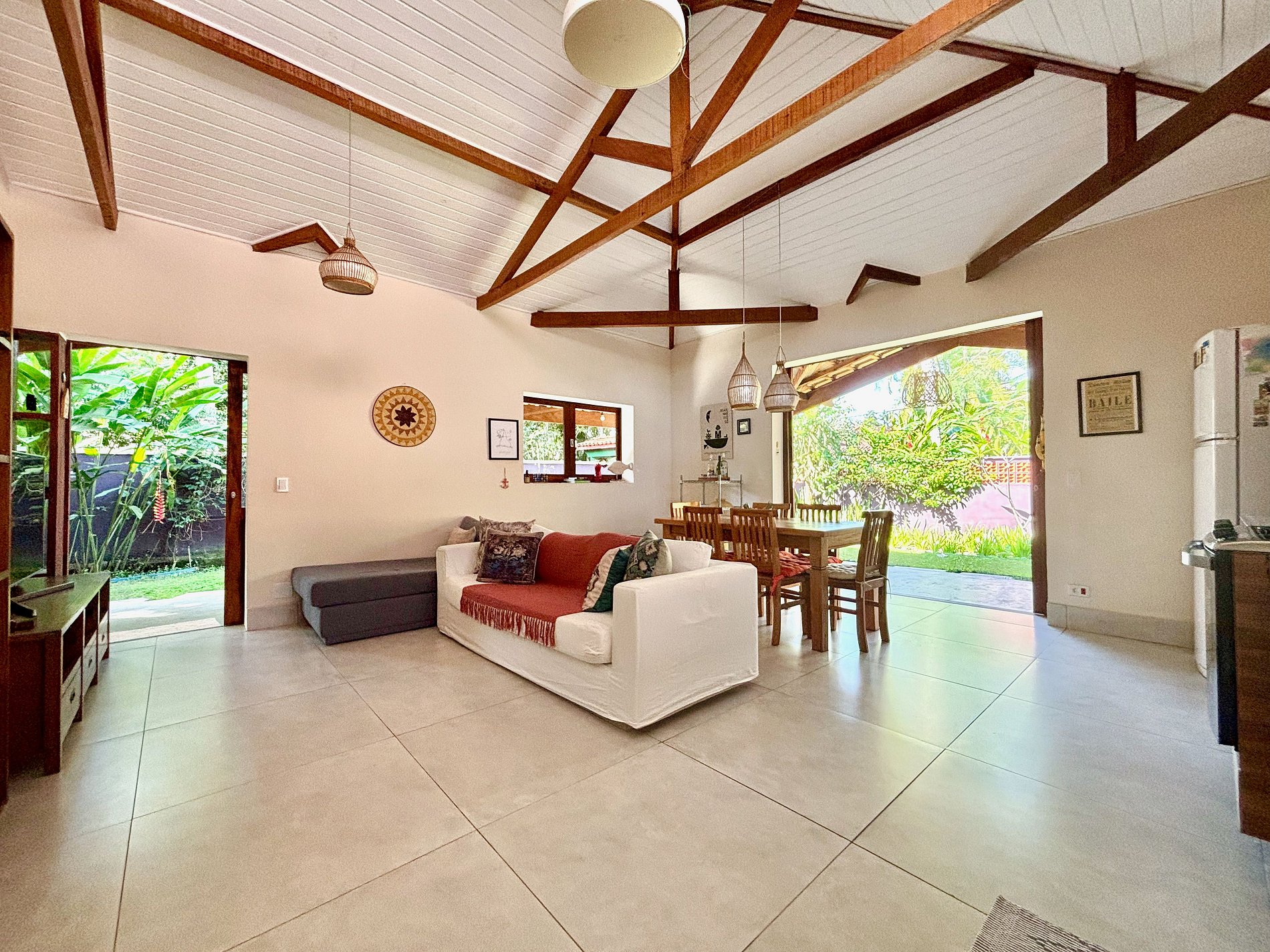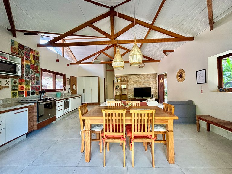 A casa oferece um amplo espaço de convivência, com cozinha integrada completa, sala de estar e sala de jantar.