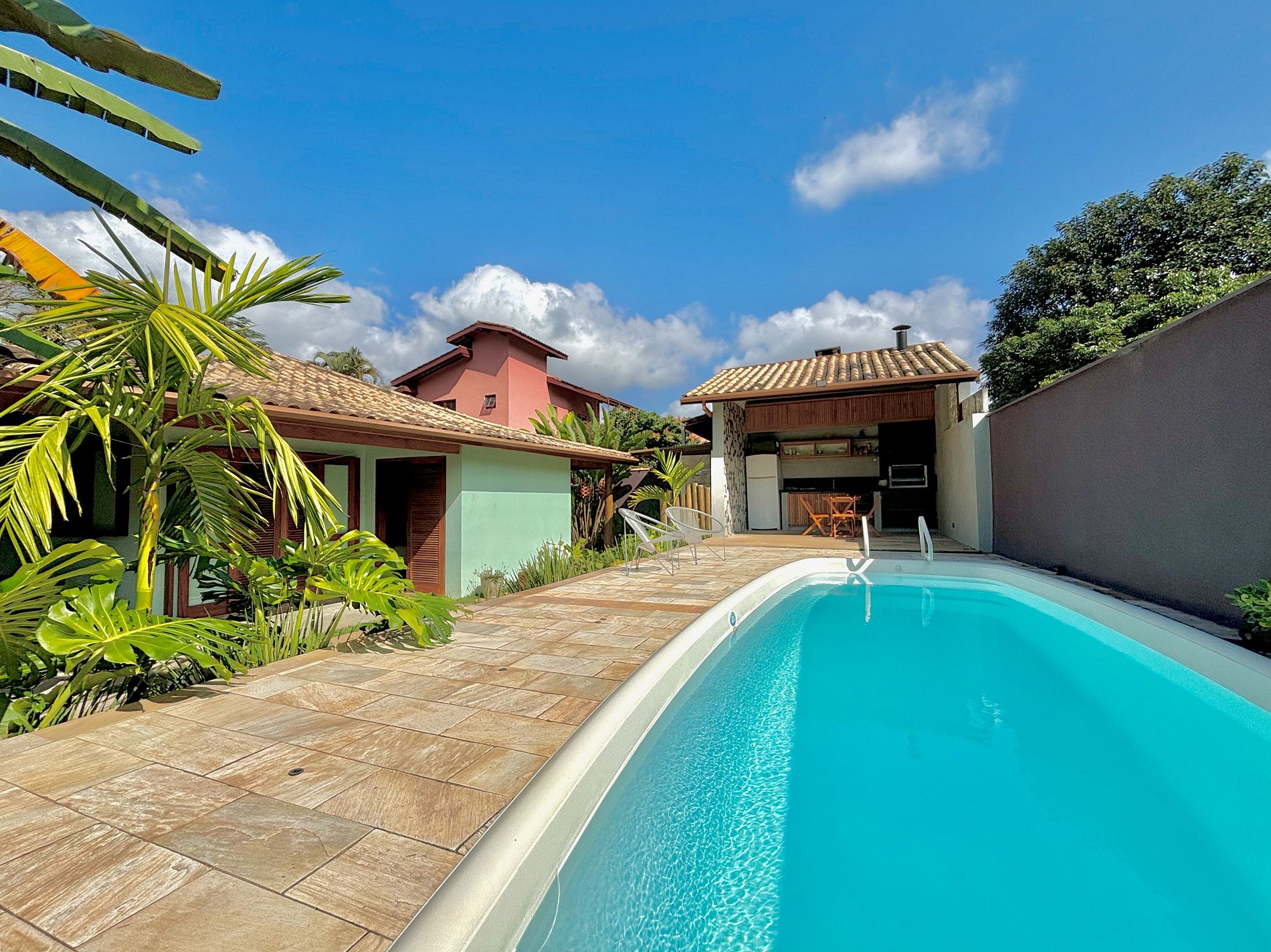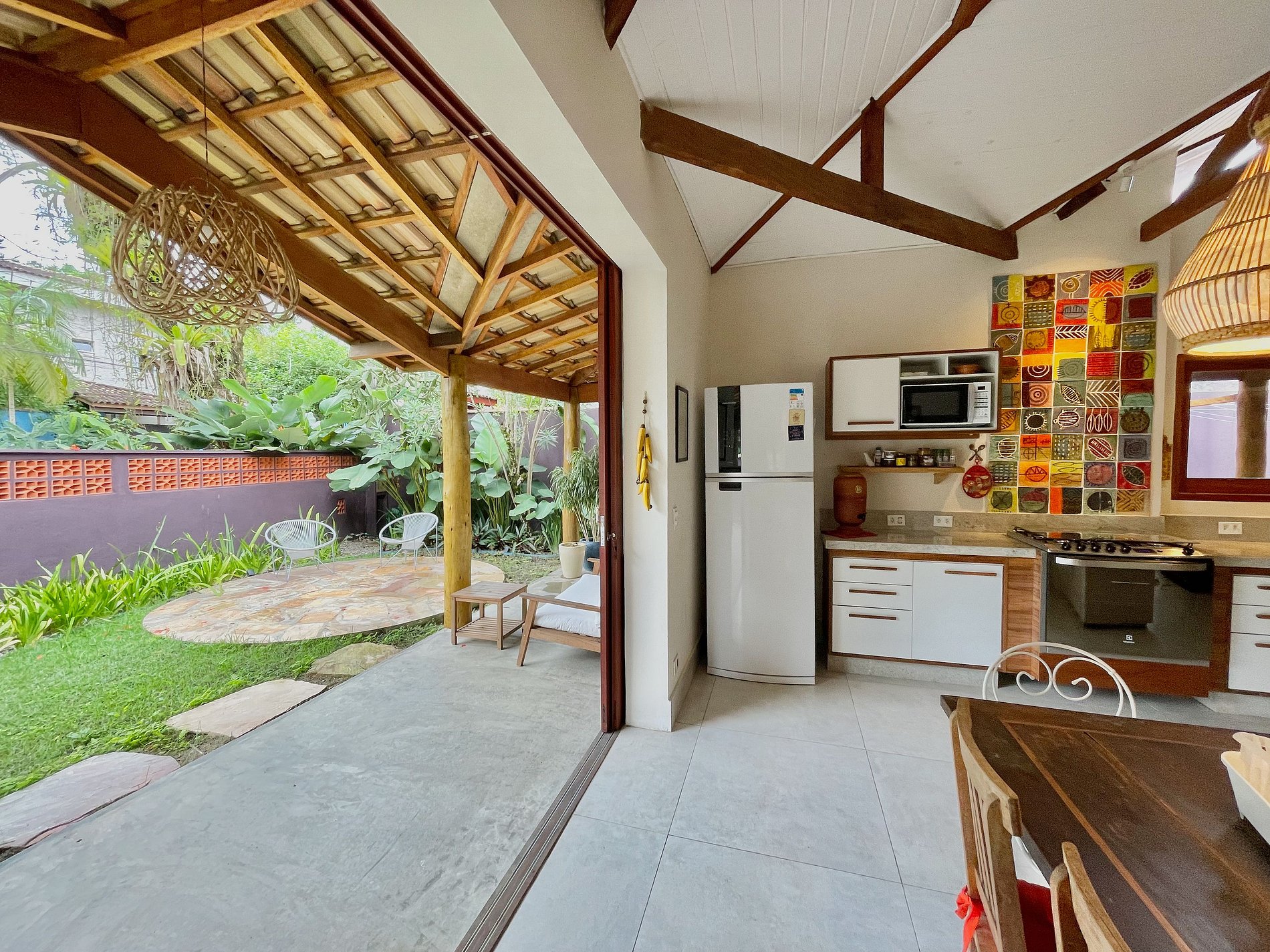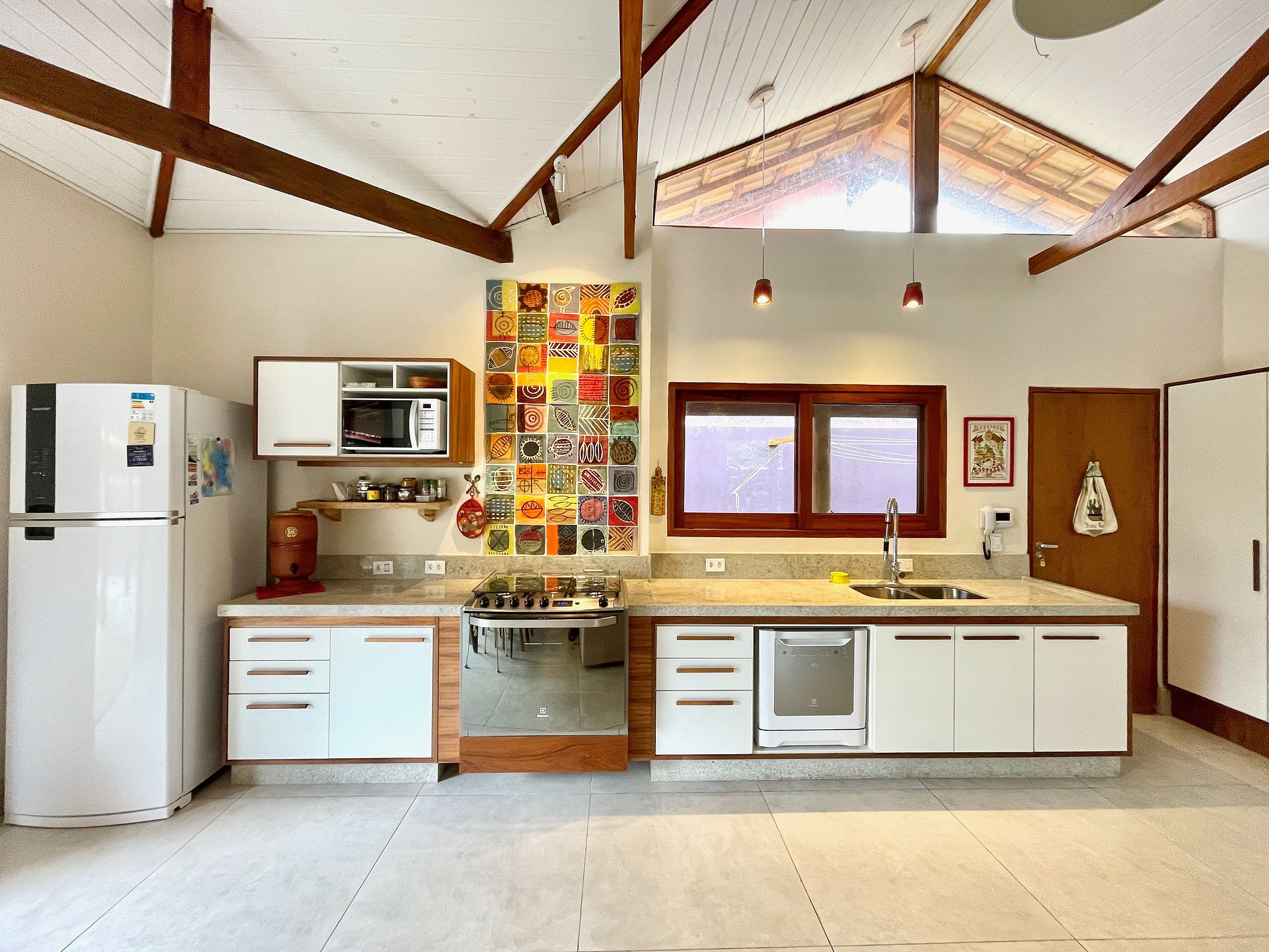 A casa oferece um amplo espaço de convivência, com cozinha integrada completa, sala de estar e sala de jantar.